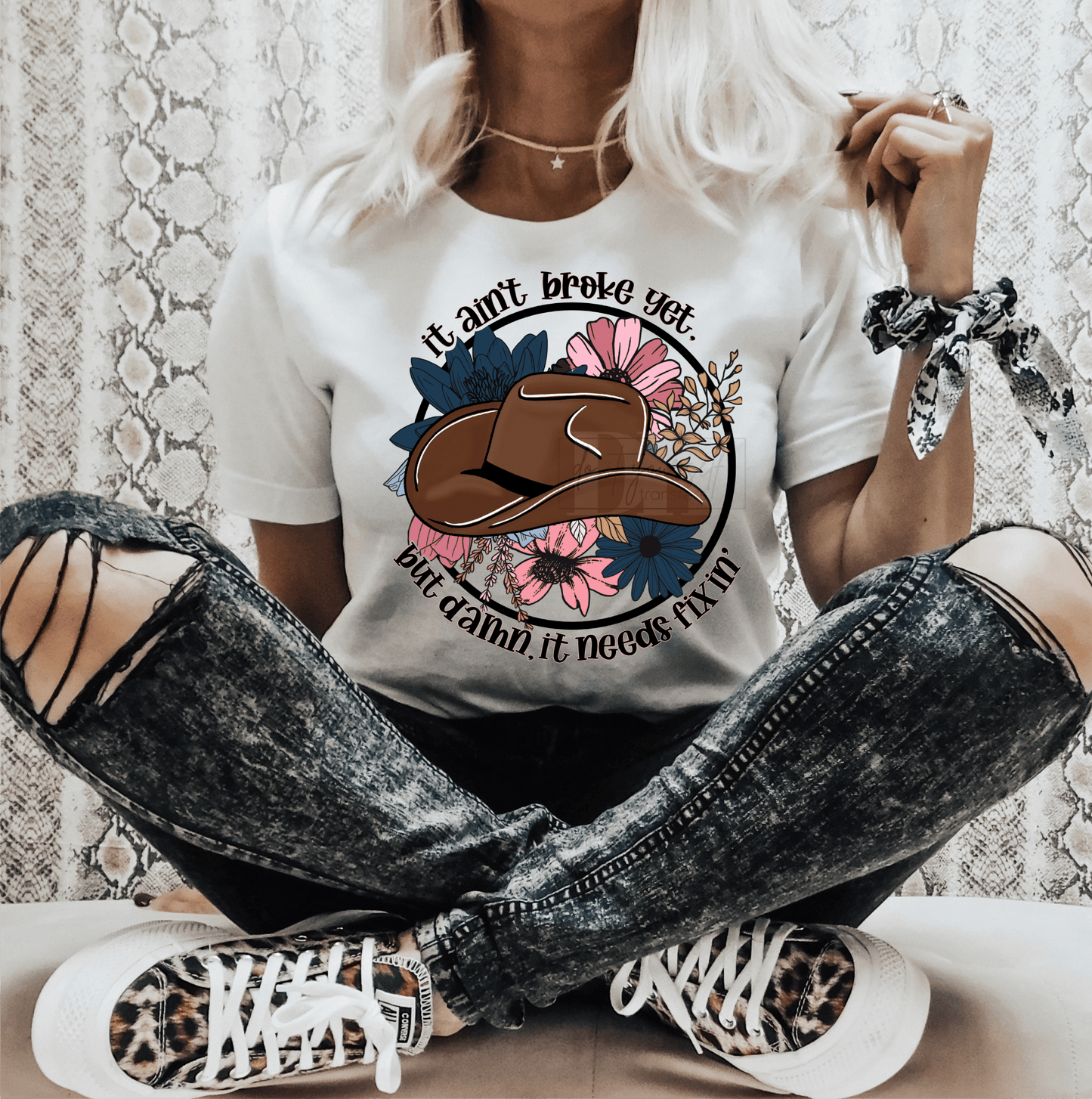 It ain't broke yet. but damn it needs fixin' cowgirl flowers hat ADULT DTF TRANSFERPRINT TO ORDER