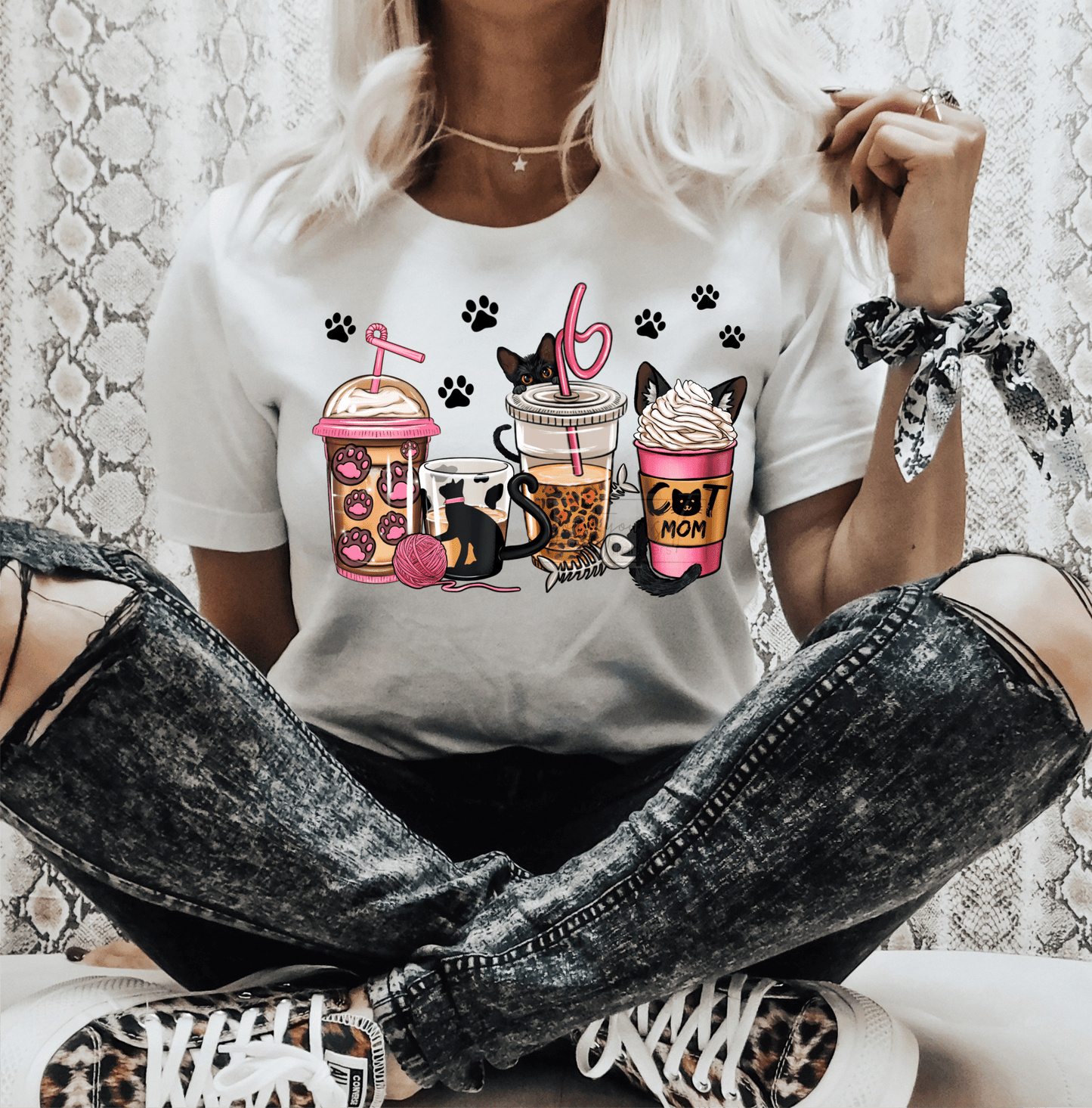 Cat MOM coffee latte pink fish size ADULT DTF TRANSFERPRINT TO ORDER
