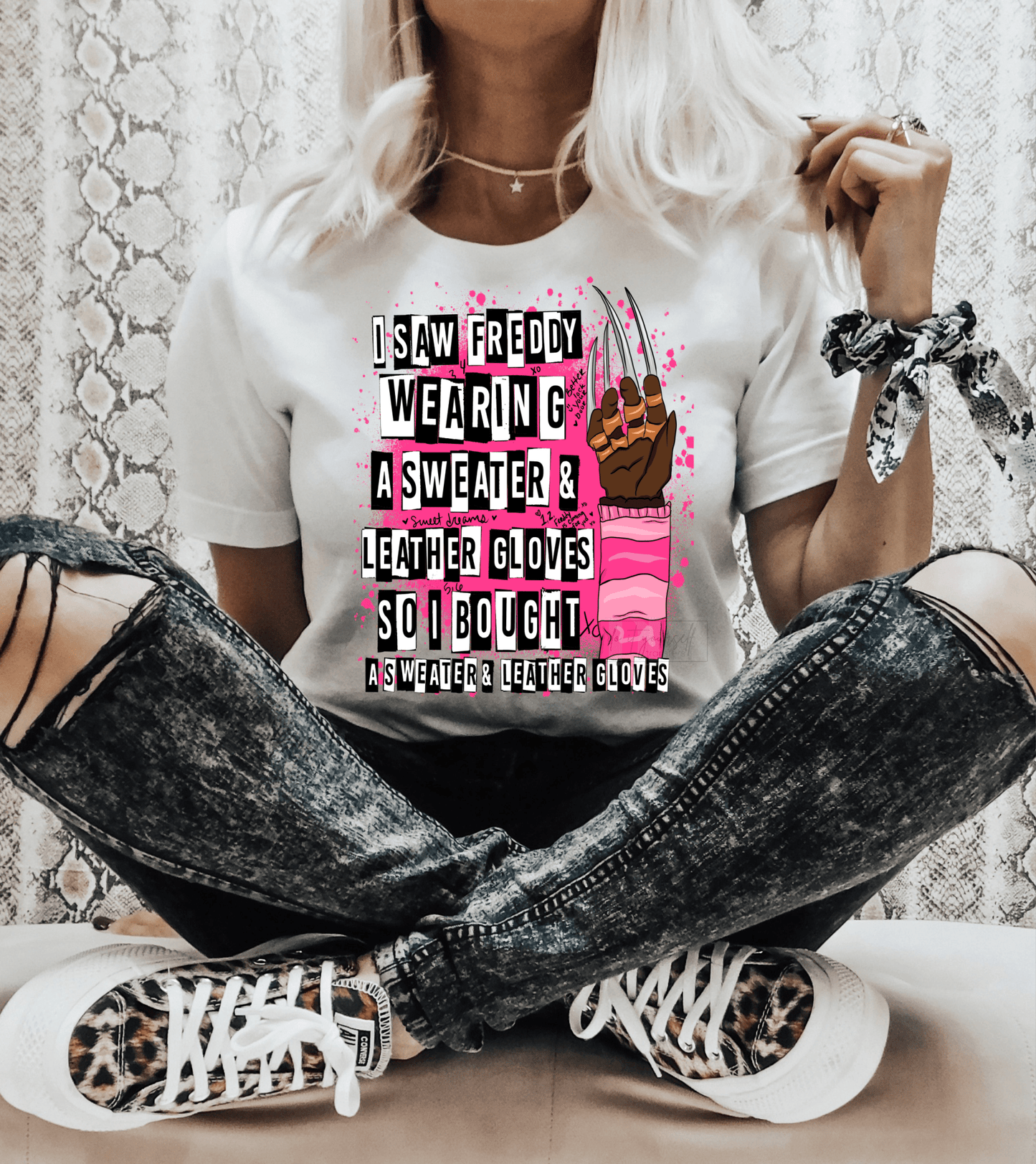I saw Freddy wearing a sweater & leather gloves so I bought a sweater & leather gloves Halloween size DTF TRANSFERPRINT TO ORDER