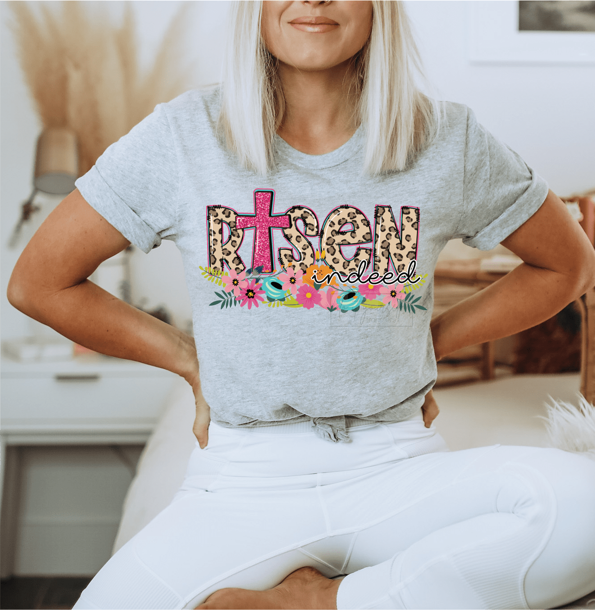 Risen Indeed pink Cross Leopard flowers Easter size ADULT DTF TRANSFERPRINT TO ORDER