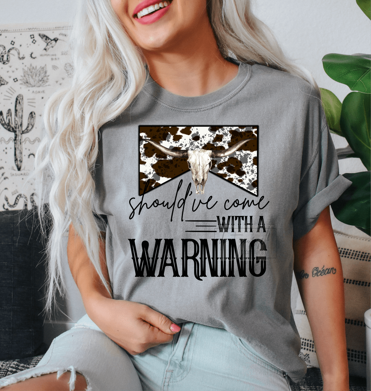 Should've come with a Warning skull junkie cow print size ADULT DTF TRANSFERPRINT TO ORDER